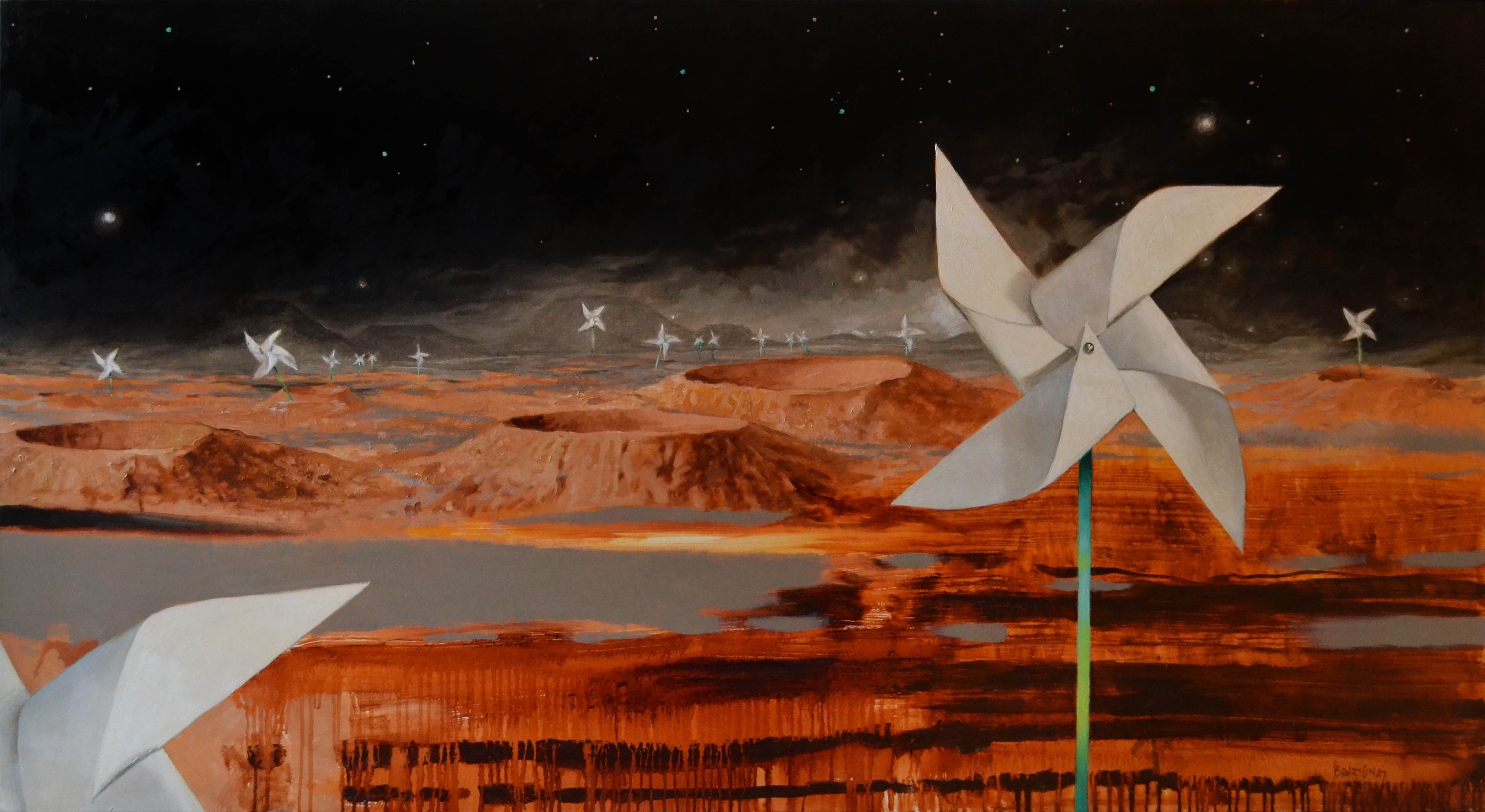 Artūras Braziūnas studied at M. K. Čiurlionis School of Arts, studied painting at Vilnius Academy of Arts. Member of Union of Lithuanian Artists. Artistic worldview of A. Braziūnas, formed in the years of our country transition, during the change of systems, is characterized by idealism, naivety and romanticism. Painter's works are attributed to the style of romantic surrealism. Paintings are realistic - nature, animals and objects depicted are transformed and interconnected by paradoxical connections and unexpected juxtapositions.